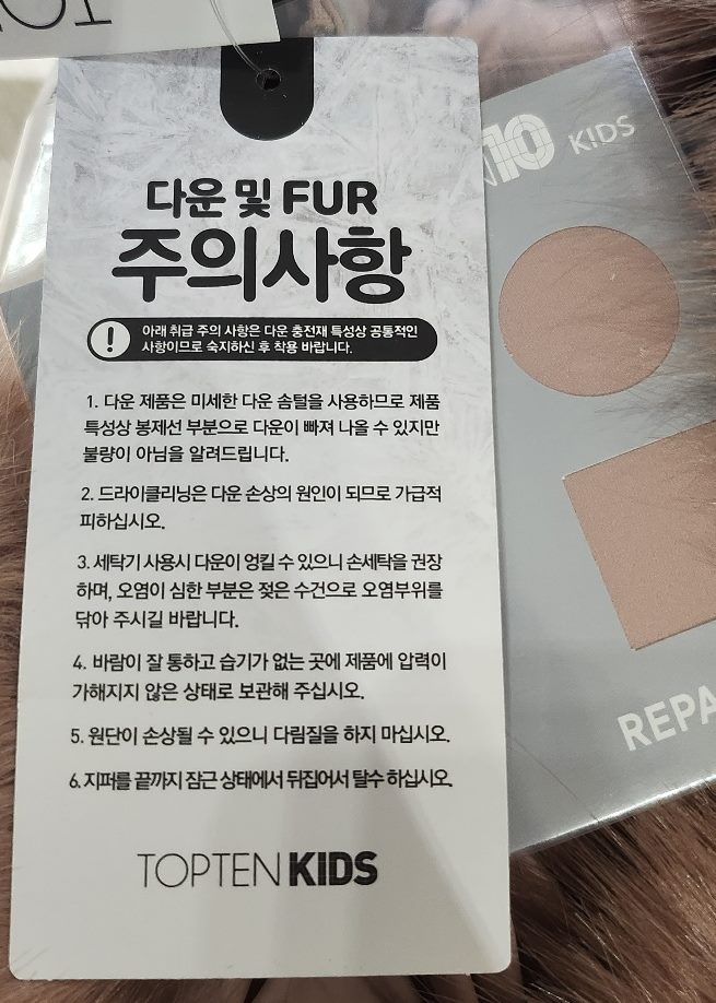 품번과 주의사항이 있습니다. 품번은 MKB4JP3932A입니다. 주의사항으로 드라이클리닝은 다운 손상의 원인이 되므로 가급적 피하라고 하네요. 손세탁을 권장하며 오염이 심한 부분은 젖은 수건으로 오염부위를 닦아주시길 바란다고 쓰여있네요. 아무래도 아이들은 옷이 빨리 더러워지는 경향이 있으니 꼭 기억해야겠습니다.