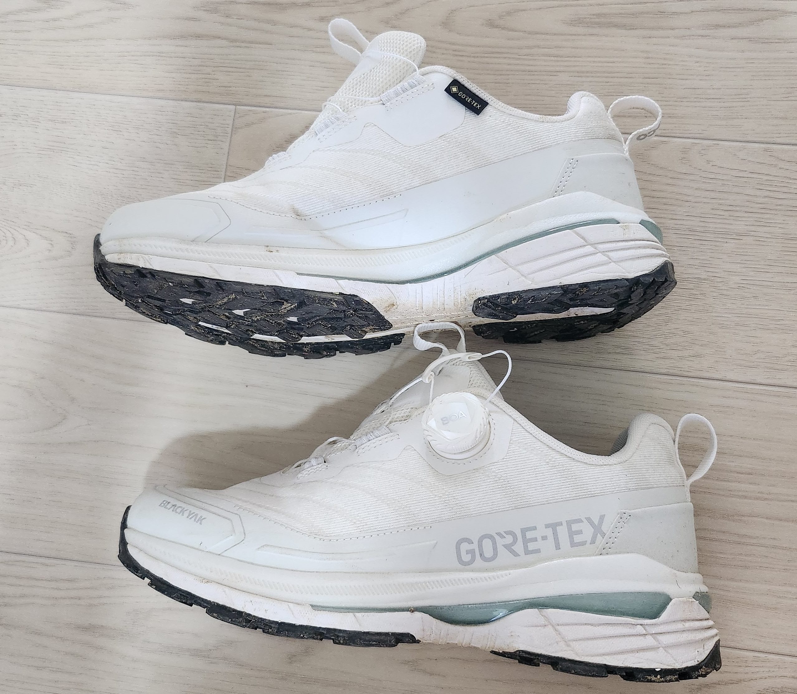 블랙야크 343 GTX는 접지력이 별 5개 중 3개이고 내마모성은 5개중 4개입니다. 비포장 도로 위 러닝과 워킹이 가능한 라인으로 최상의 안정성과 경량성을 제공한다고 하는데요.