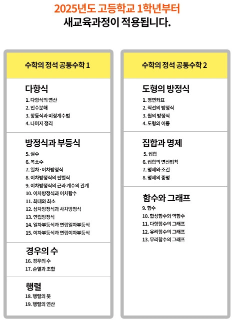- 공통 과목: 공통수학1, 공통수학 2, 기본수학 1, 기본수학 2