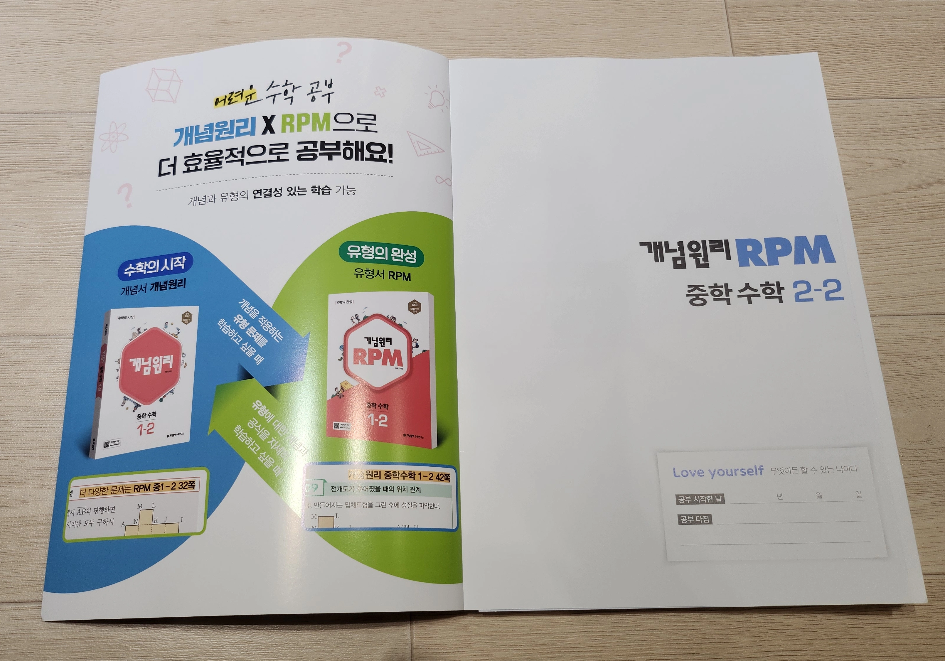 개념서인 개념원리와 함께 풀면 좋은 개념원리 RPM 유형 문제집입니다. 보통 개념원리와 개념원리 RPM을 함께 진행하지만 학원에서는 라이트쎈을 개념서로 진행하고 유형 문제집으로 개념원리 RPM을 함께 하게 되어 구입하게 되었습니다.