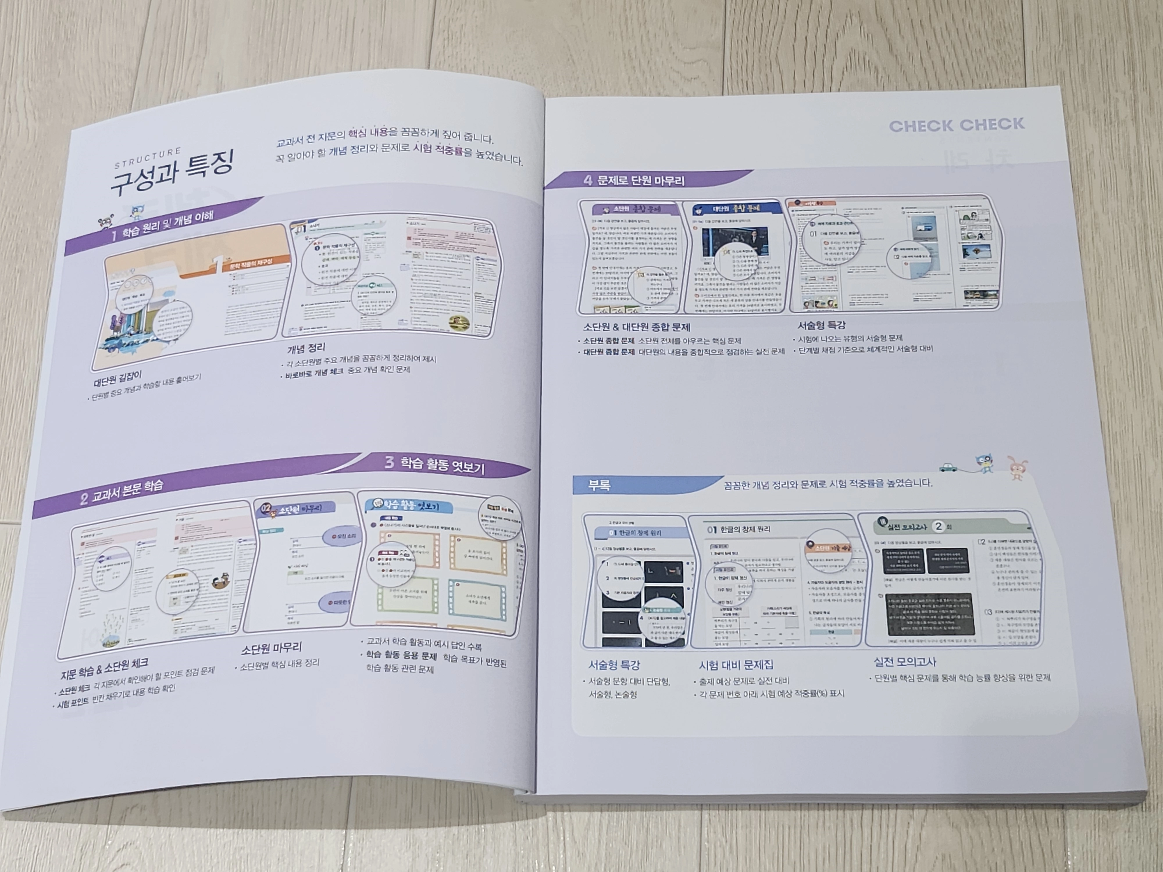 체크체크 국어 교과서편의 구성은 총 4단계로 되어 있습니다. 우선 학습 원리 및 개념을 이해하고 교과서 본문 학습, 학습 활동 엿보기, 문제로 단원 마무리 하기로 구성되어 있고 부록에서는 꼼꼼한 개념 정리와 문제로 시험 대비도 해볼 수 있습니다.