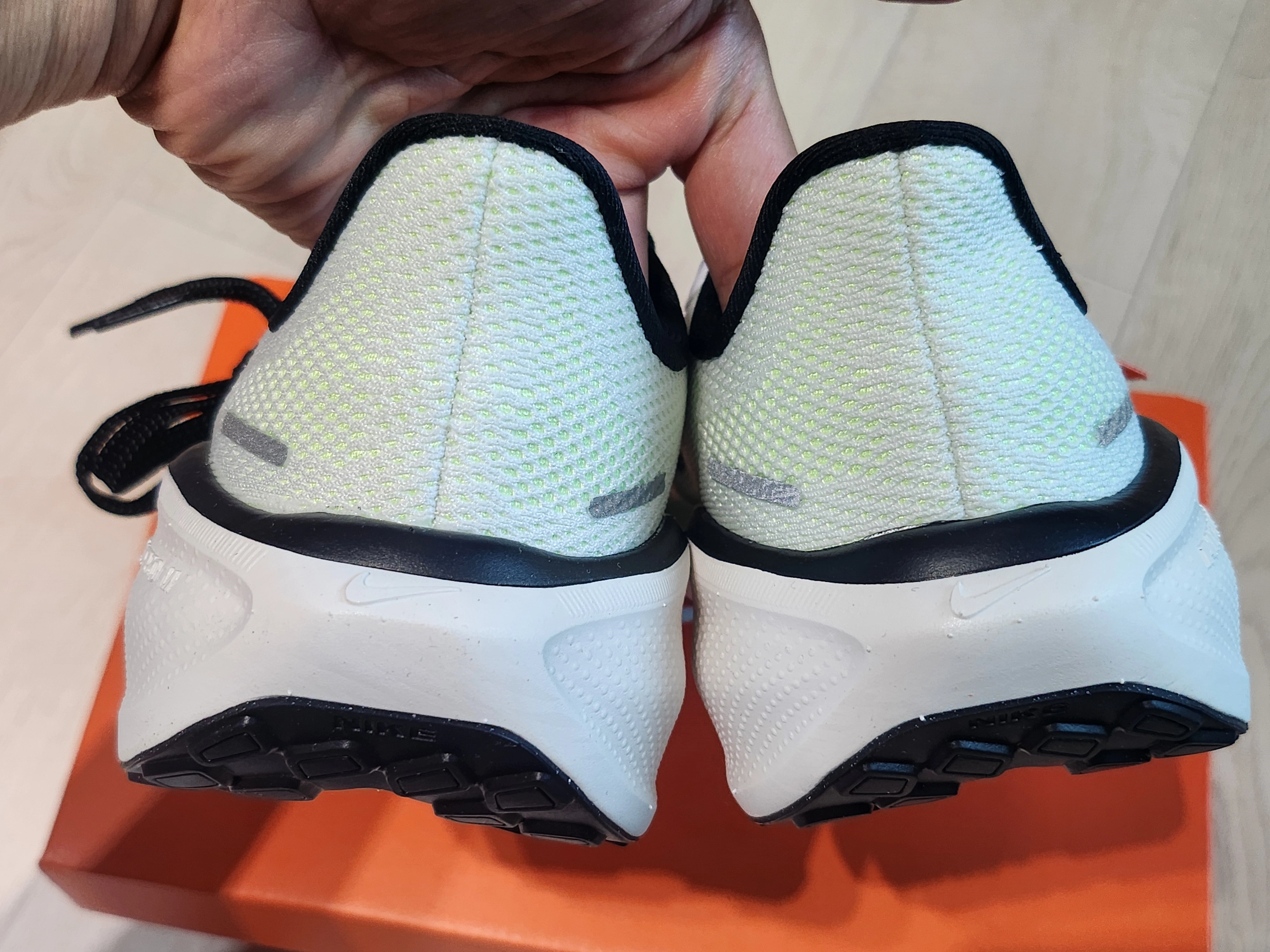 페가수스 41 옆면입니다. 외관은 일반 나이키 운동화와 달리 쿠션이 좋아 보 이는데요. 발이 지면에 닿는 순간 착지 공간을 최적화하는 넓은 뒤꿈치가 특징입니다. 최근 황영조 님의 유튜브 영상에서 아마추어는 리어풋으로 하는 게 맞다고 하는데요. 리어풋에 최적화되어 있어 보입니다.