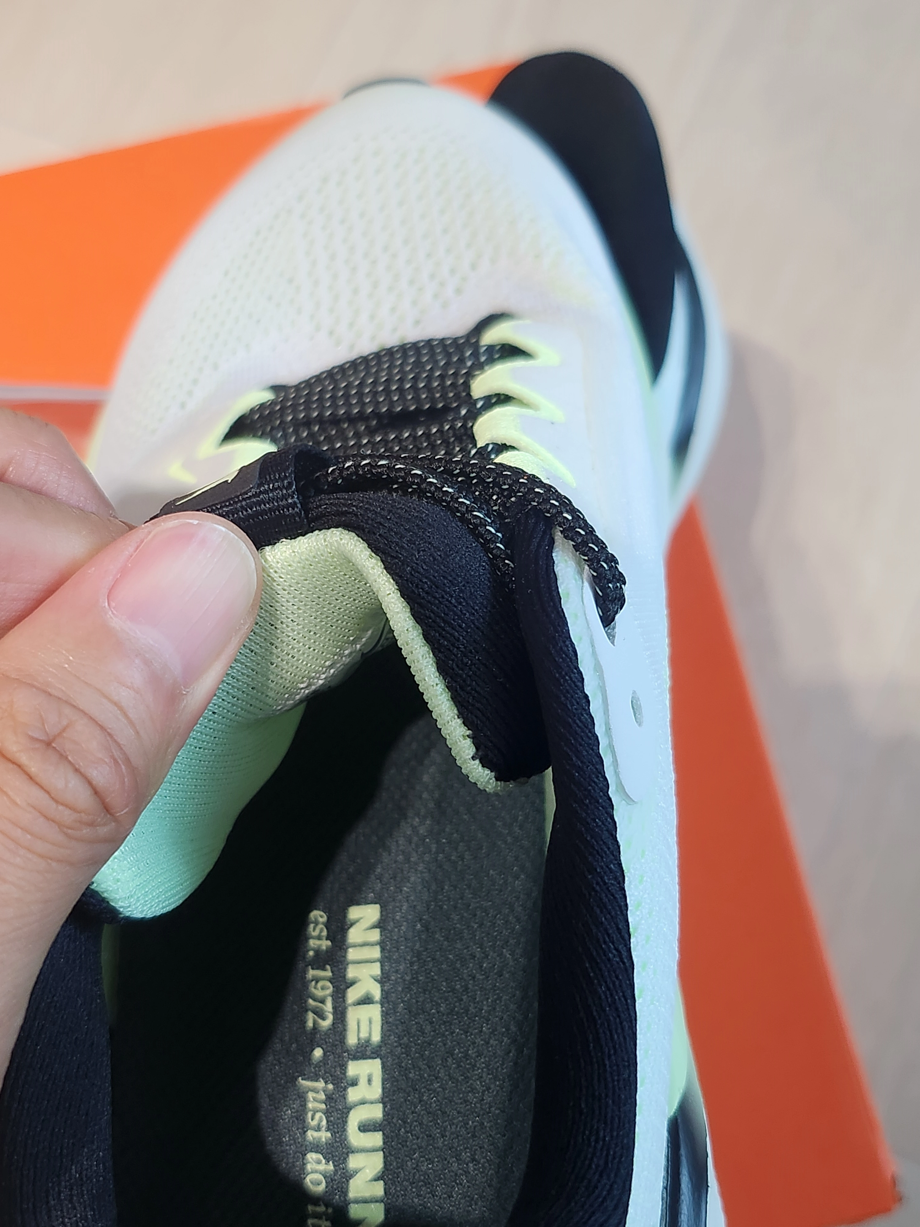 약간은 형광색 느낌이 나네요. 신발은 사진보다 실물이 더 예뻐보이긴 합니다. 상단에 엔지니어드 메쉬를 사용해 무게를 줄이고 통기성을 개선했다고 합니다. 신발끈도 페가수스 40보다는 저 예쁜 클래식한 신발 끈이라서 더 예쁩니다.